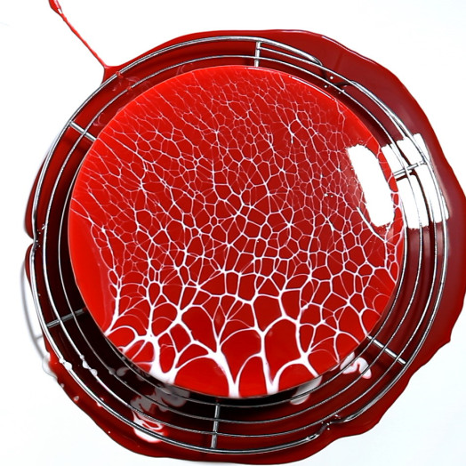 Usually I use this recipe. It’s simple and standard recipe for glazing. But you can use any other recipe to get this spiderweb effect. Glaze recipe: the red one on the video. 75 g water 100 g sugar 100 g glucose 66 g of condensed milk 8 g of gelatin 180b 100 g of white chocolate red food coloring Soak…